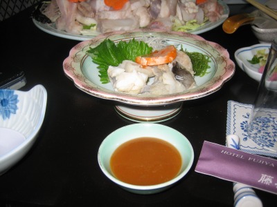 18:51 湯引き 続いては、アンコウの湯引き。 (と、書いていますが、料理は一度に運ばれてきています) アンコウの各部をさっと湯通ししたものを、酢みそを付けて食べます。 これも、美味しいですねぇ。 アンコウの味が濃いので、酢みその味に決して負けません。 |