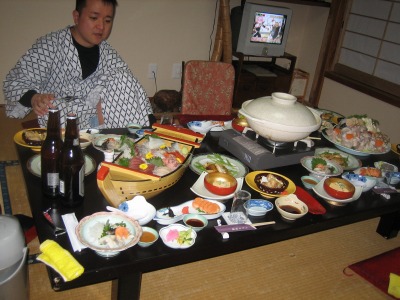 18:56 全景 ドーンと、これが今夜の料理全景。 そして、それを前にした満足そうなすーさん。 |