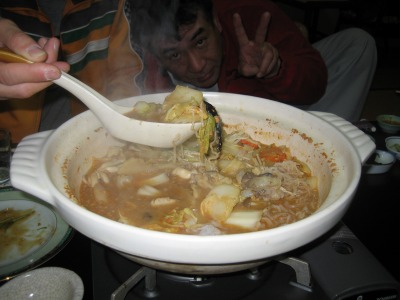 19:15 鍋ができました アンコウ鍋が出来上がりました。 いやいや、写真写りが悪いですね。 流石、”どぶ汁”美味しそうに見えませんが、これが旨いんだな。 味は濃厚、かと言って白身の魚、決して脂っこくはありません。 ボリューム感があって、『食べたぁ〜』って感じがあります。 |