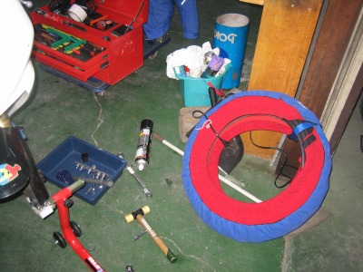 21:41 今度はフロント 今度はフロントタイヤを交換。 写真はビーツブレーカーでビートを落とした状態。 これから、タイヤレバーでリムから外します。 |