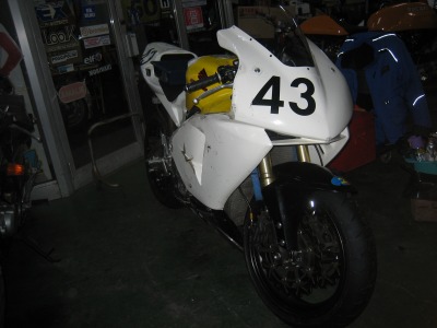 22:25 車体に装着 フロントタイヤを装着して、ちゃんとトルクレンチで規定のトルクでボルトを締めて完了です。 これで、ラジエータに水を入れて、バッテリーをつないで、ガソリンを入れれば、いつでも走れる状態です。 久々にバイクをいじって楽しかった。 |
