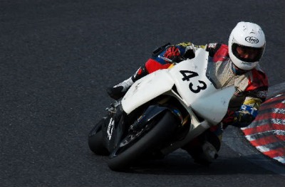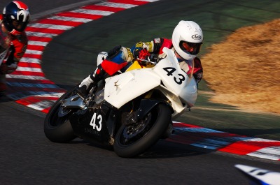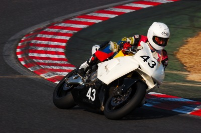 2走行目 10:30から 2走行目は、リヤのタイヤウォーマーの配線が切れてしまったので、フロントだけタイヤウウォーマーを使ってから走ります。 リヤタイヤは冷えているので、グリップはあてになりません。 1走行目から比べると路面温度は上がっていますが、やはりタイヤが暖まっていないので、グリップしません。 コーナーに入り、バイクを倒し込むと、”ツーーー”とリヤが滑ります。『やっぱ、グリップしないのね』 タイヤを早く温めるよう、バイクを起こしてから、タイヤをつぶすようにアクセルを開けていきます。 ブレーキングをして1コーナーに入っていこうとすると、接地圧が減ったリヤタイヤは前に出たそうな挙動になります。『う〜ん。気持ち悪い』 まさか、このまま8秒台で終わるわけにはいきません。 6周目まで我慢して、7周目からペースアップ 『ああ、7秒台入りましたね』 1段下げたステップも良好です。 イン側の脚が苦しくなく、荷重を抜くことができます。 アウト側のステップに荷重をしていくと、バイクは起きて、体はイン側に入っていきます。 いい具合です。 後半はタイヤも暖まってペースアップ。 1走行目では気持ちが足元のタイヤにいっていましたが、2本目は前に行くようにして走ります。 今日は、4秒台は出るはずもなく、5秒台が出れば上出来。6秒台で良しと考えていました。 無理をしないで、一応6秒台に入ったので、まあ良しとします。 (ベストの2秒落ちですから、けして”良し”ではありませんが) 骨折から向こう、体を怠けさせて、体重が増えて切れが悪くなっているのを通過しました。 |