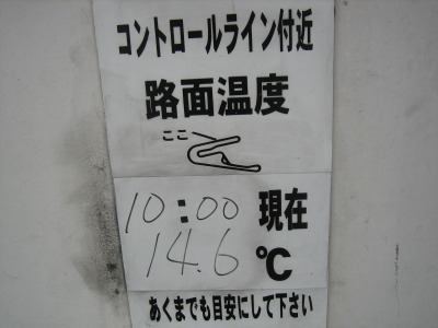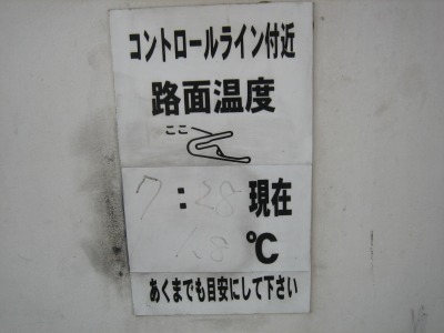 8:23 コンディション 走行券を買いに行った帰りに、コースインゲート脇の温度計と路面温度をチェックします。 気温5.0℃ 路面温度 1.8℃(7:28) 寒〜ぅ。 1時間前とは言え、路面温度1.8℃って言うのは、ちょっと・・・^^; 8:30の走行開始時点でどのくらい路面温度が上がっているか分かりませんが、レーシングタイヤの温度レンジをはるかに下回っていますね。 ある程度はグリップするのかな? |
