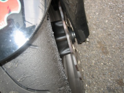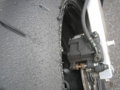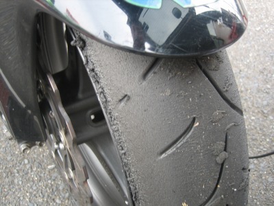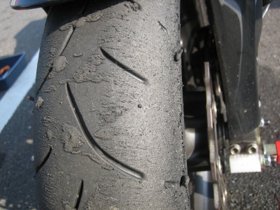 こちらはフロントタイヤ。 上は右。 寝かせてないので、エッジ部分が残っています。 こっちも、右側はきれいに減っています 下は左。 こっちは、ちょっとタイヤをこじっているみたい。 いずれにせよ、バンクエンドまでは使っていませんね。 |