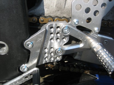 9:46 ステップ位置 コーナーのイン側で、ステップの位置が高くて、脚の自由度がないので、ステップの位置を1段下げます。 今までのステップの位置はオパミンから買ったときのまんま、一番後ろで、一番高い位置です。 |