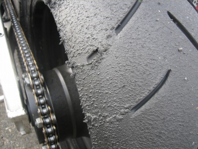 9:04 タイヤ 走行後のタイヤ。 なぜか前だけ。(リヤタイヤは取り忘れました) 寒かったので、バンク角は抑え気味、当然エッジまでは使っていませんね。 |
