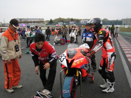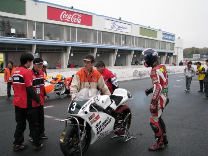 15:53 グリッドに ST600のレースも押して、15:25分から決勝スタートの予定が、ようやくグリッドに今付きます。 オパミンは国際A級に混じって予選19番手、7列目アウト側からのスタートになります。 |
