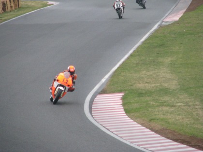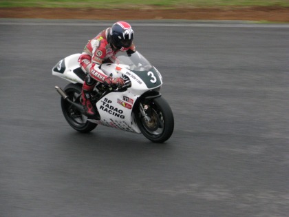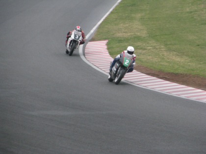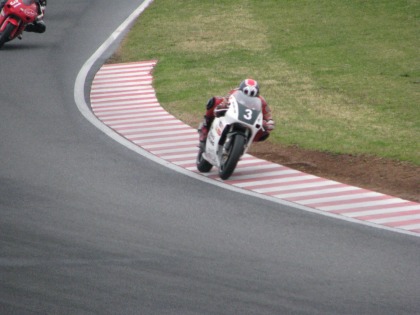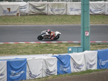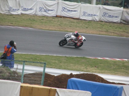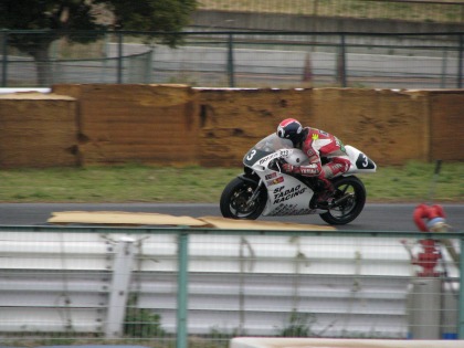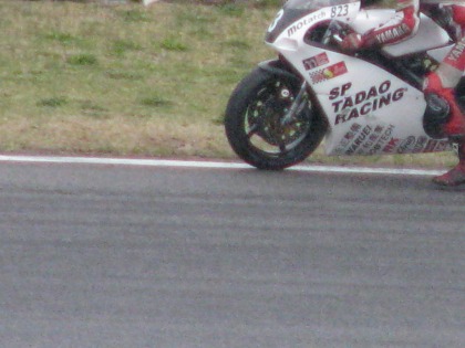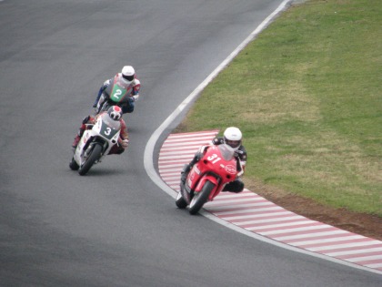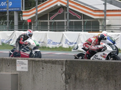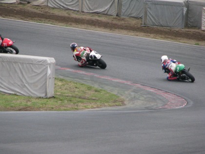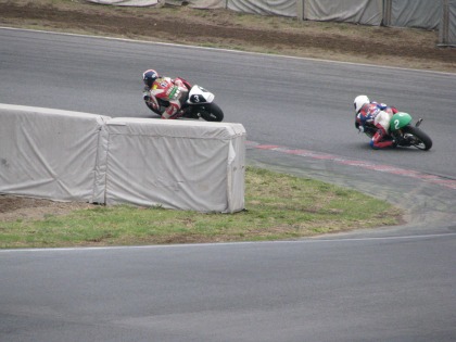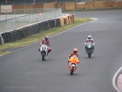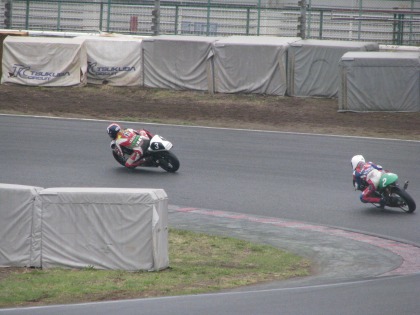 14:09 追います。 ちょっと、前からまた雨が降り始め、路面を濡らし始めました。 GP250のドライはST600の溝付きと違い、完全なスリックタイヤ。 雨の時は思いっきり滑るらしい。 (自分はスリック履いたことがないので、分からない) |