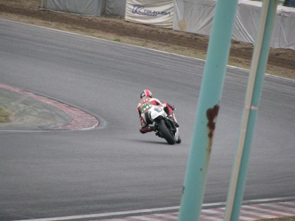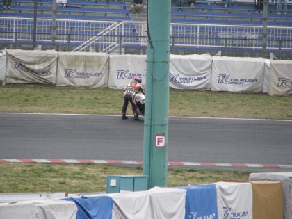 14:10 やっちゃったぁ 1ヘアピンで転倒! 濡れ始めた路面に足をすくわれてスリップダウンを喫しちゃいました。 すぐに駆け寄り、マシンを起こします。 この間に、2台3台と抜かれていきます。 (鉄柱邪魔だぁ~!) |