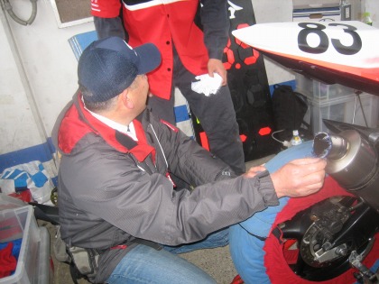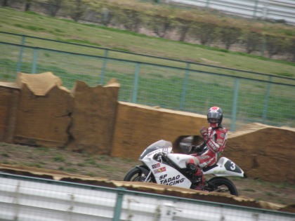 レース中はヘルパーでサインボードを出しているので、写真はなし。 19番手からスタートして、スタート良く2~3周で13番手くらいまで上がります。 その後、4周ほどしてふたたび雨が落ち始め、路面を濡らします。 6周を終了して、サインボードを出す準備をしてもオパミンは戻ってきません。 やっちゃったか? |