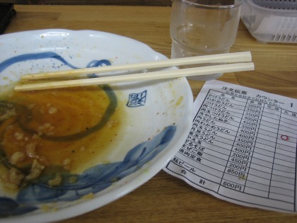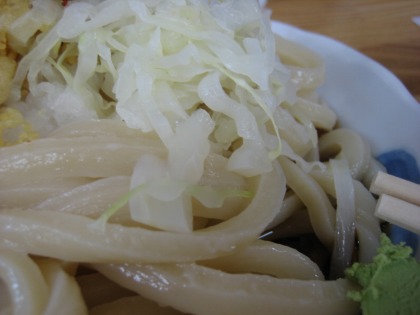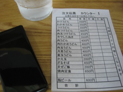 12:04 注文 久しぶりなので悩みますが、今日の様に暑い日は、やっぱり冷やしたぬきですね。 と言うことで、冷やしたぬきの”大”を注文。 大盛りで¥450-はお得。 注文をすると、隣の席に”肉玉つけうどん”が到着。 他の人が食べているものは美味しく見えます。 「こっちにしておけばよかったかなぁ」とちょっと後悔。 |