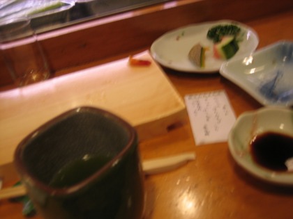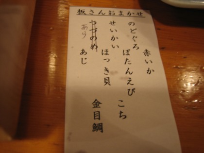 12:36 注文 お店の中は、カウンターだけで13席それに6人は座れるテーブル席が6卓以上、それに加え2階もあるような大きな店で、しかもほぼ満席で混み合っていました。 本当なら、贅沢をして単品で頼みたいのですが、この混雑ぶりでは、それを許してくれそうもありません。 結局注文したのは、地魚でまとめた”板さんおまかせ”セット(¥2,600也) 注文から15分ほど待って、お寿司が出てきました。 これに、茶碗蒸しとカニのみそ汁&デザートが付きます。 それでは、さっそく、『いただきます』(^_^) ネタはどれも新鮮で美味しいです。 シャリは固めに焚かれていて、東京の寿司屋より2割ほど大きめで、しっかりと握られて存在感があります。 自分としてはシャリはこれくらいの方が良いですね。 まあ、一般的に東京の寿司屋のシャリは世界一小さいと思います。米の粒が数えられる位に。 で、一番美味しかったのが上の真ん中にある”せいかい”。(~o~) 初めて聞く(見た)魚の名前です。 今、こうしてレポを書きながら、ネットで調べてみると、メバルの仲間の”ウスメバル”と言い、今が旬の日本海の魚だそうです。 人間長生きをするもんだ。(まだ44歳だけど) まだまだ、食べていない美味しいものがあるぞ。 ”のどぐろ”も”こち”も”あら”も美味しかったけど、洗練度から言って、”せいかい”が正解。 (これが書きたかった) お客に出すお寿司のネタを紙に書くのは、カウンターのお客に「これは何?」といちいち聞かれるのが面倒だから?と少々感じる様な雰囲気があります。 ただ親切と言えば、親切。 板さんが、握りを間違えない。と言った副産物もあります。 混んでいるので、和気あいあいとゆっくり食事をするには向きませんね。 |