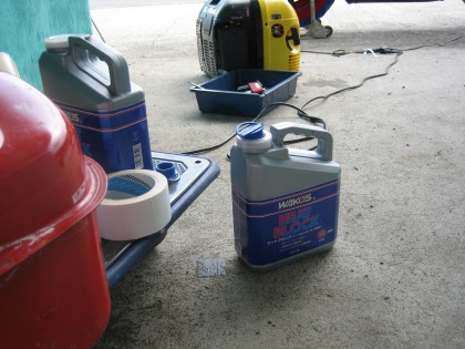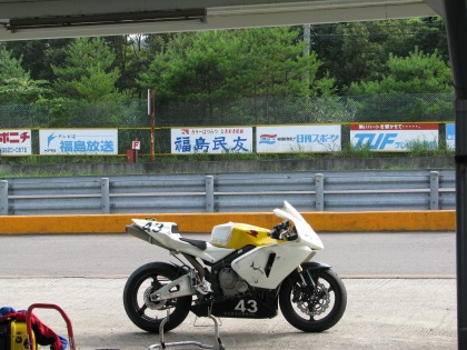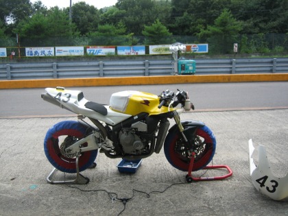 12:36 まずはマシン整備 久しぶりの走行になるので、一昨日の晩に充電したバッテリーをまずは接続。 タイヤのエアー圧を確認して、標準の1.9kgへ。 フロントはエアーが落ちていて1.6kgでしたが、リヤはなぜか2.2kgもはいっていました(?) エアーをチェックしたら、タイヤウォーマーを巻いて、タイヤのウォームアップ開始。 エビスサーキットはP-LAPのセンサーは埋め込まれておらず、専用の計測器をリヤカウルにガムテで取付。 3月の練習のあとラジエータの水を抜いていたので、ワコーズのヒートブロックを注入。 一応、オイルのレベルを確認して・・・ちょっと汚い。 前回交換したのが、昨年10月のレースの前なので、あまり走っていませんが、交換した方がベターでしたね。 そして、ガソリンを入れて、ウォーミングアップ。 4月にフロントフォークのメインテナンスをしているので、セッティングが元の状態に戻っているか確認 OK、大丈夫。 走行前の準備は完了です。 |