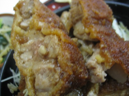 18:43 カツが カツ全体はさっとソースに漬けた様な感じで、表面だけ染みていて、衣の内側はまだサクサク感が残っています。 それでもって、中の肉は厚みがあってボリュームタップリ。 (ただアップで見ると、全然美味しそうじゃない!) 噛むと肉汁が出てきて『あちっ!』となります。 ご飯とカツの間には、千切りのキャベツが敷き詰めてあり、これがカツの熱と、カツから出た油とソースがいい具合に染みて美味い。 ただし、ちょっと脂身が多めなので、脂身の苦手な人にはヒレがお薦めでしょう。 |