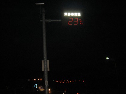 18:56 夜は涼しい 食事をすませて、店の外に出ると陽はすでに暮れて、涼しい風が吹いています。 南関東では連日真夏日を記録していますが、福島県の標高500mほどに位置する岳温泉では、夜になると23℃と、とても過ごしやすい気温でした。 さて、ぼちぼち出発することにします。 |