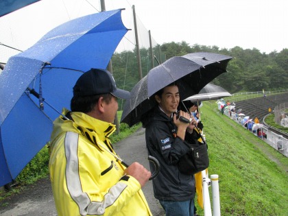YAMAHAの傘を持って、コースをじっと見つめているのは、元全日本500CCチャンピオンの藤原儀彦さんではあ〜りませんか。(と気が付いたのはRyo@Mさん)