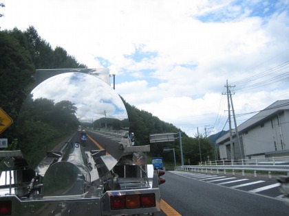11:51 国道19号線は 国道19号線は、元々が中山道だった路線なので、長野県の松本、塩尻と中津川、南木曾を結ぶ、トラックの交通量が多い動脈路線です。 路線のほとんどが、黄色いセンターラインの追い越し禁止区間で、抜いても抜いてもキリがないバイクには退屈な国道です。 自分も退屈なので、ステンレスのタンクローリーの後ろについて、自分自身の走っている姿を記念撮影。 |