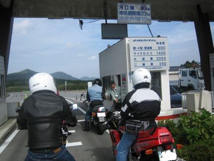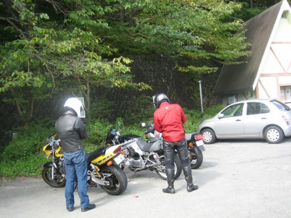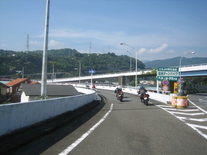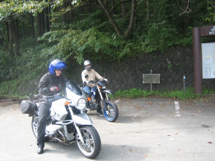 10:20 出発です こちらの写真は、BMW R1150のドイツ製耕耘機愛好家さん。ハンドルネーム長すぎ! 別名、骨折くん。 でも、・・・自分も骨折くん と、カワサキ D-TRACKERで参加のアベちゃん。 唯一、250CCでの参加ながら、元気な走りで、結構遅れずについてきます。 あとは、同じカタナの山口さんと奥山さんがいますが、ここでは写真なし。 |
