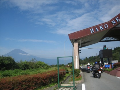 9:48 箱根スカイライン 芦ノ湖スカイラインで湖尻まで進み、そのまま直進して、箱根スカイラインに入ります。 箱根スカイラインは、芦ノ湖スカイラインと同様に神奈川県と静岡県の県境の稜線を走る自動車専用の有料道路です。(二輪\250) 箱根スカイラインに入ると、もう芦ノ湖が見える場所はありませんが、ご覧の通り、進行方向に富士山を眺めながら、走ることができます。 箱根スカイラインは約5kmの距離があり、こちらも芦ノ湖スカイラインと同じように中低速コーナーが連続し、かつアップダウンがあるため、走りがいのあるコースです。 両方のスカイラインを通ると、\500になりますが、静岡県道路公社が運営しており、現金徴収、ETCカードが使えないのが、とっても不便。 |