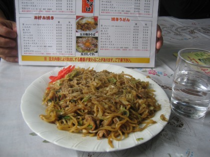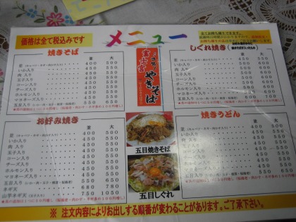 12:05 メニュー メニューは、焼きそば、お好み焼き、しぐれ焼き、焼きうどんに、もつ焼きやおでん、なんかもあり結構充実しています。 近所にあれば、ビールなんかを飲みつつ、モツやおでんをつまみに、なんてこともできるんですが、日帰りツーリングじゃ、そんなことはできません。 ちなみに、しぐれ焼きとは、お好み焼きに焼きそばが入ったやつですが、広島焼きとはちょっと違います。 それで、自分の注文は、”焼きそば(肉入り)並”。 と ”お好み焼きの並”の2品注文。(^o^) |