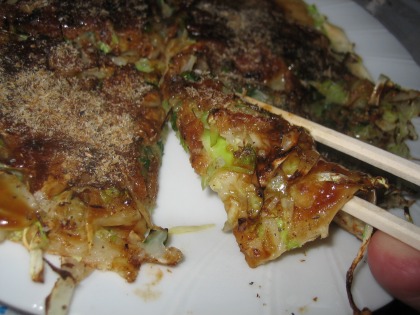 12:21 お好み焼き 続いて、お好み焼きが出てきました。 向こう正面は、田口さんが頼んだ、しぐれ焼きの”大”。 とっても大きい。 大きさを比較しようと、一緒に写真に撮りましたが、無効の方が遠いので小さく写ってしまい、今ひとつ大きさが分からない写真になってしまいました。 |