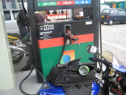 13:25 ガソリン求めて 富士宮の市街地をガソリン求めて、少しうろうろ。 アベちゃんのD-Tracker は足が短いので、来たときの道沿いにあるJOMOで給油をします。 ウロウロしているうちに、シールドに雨粒が! でも、まだ空は明るいので、本降りにはならないでしょう。 |