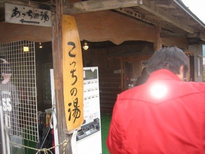 14:08 こっちの湯 富士山も見えず、甲府盆地は雲の下なので、近くの山の紅葉が鑑賞できる”こっちの湯”に入ることにしました。 富士山を眼前に望むことができる”あっちの湯”に比べると人気はイマイチだそうですが、その代わり落ち着いて入れるところが良いところだそうです。 さっそく、販売機で入湯料¥700を払って入ることにします。 ここ”ほったらかし温泉”の”あっちの湯”と”こっちの湯”はつながっていません。 なので、両方入ろうとおもったら、その都度入浴料を払わなければならないので、¥1,400かかっちゃいます。 |