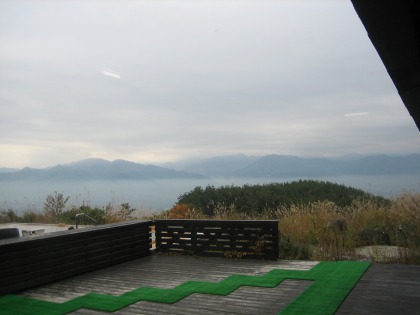 13:55 あっちの湯 ”ほったらかし温泉”には2つのお湯があります。 一つは、この屋根の下にある、富士山の方向を向いた、”あっちの湯” 晴れていれば、甲府盆地を眼下に、正面に富士山を望むことができる。らしい・・・・・ が、今日は曇っていて見えません。甲府盆地も靄(もや)の下に沈んでいました。 |