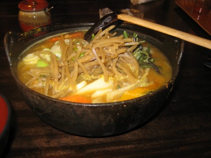 17:01 かぼちゃほうとう 注文したのは、一番シンプルかつほうとうの王道”かぼちゃほうとう”。 (¥1,100) かぼちゃが入ってこそ”ほうとう”。 かぼちゃが入っていない”ほうとう”なんて、ただの味噌煮込みうどんではありませんか?と言うくらい、基本的な食材です。 前書きが長くなりました。 さっそく、『いただきます。』 蕎麦も好きですが、自分は麺類が全般的に好きです。 このほうとうも、モチモチした太目の麺が、食べ応えがあって良いですね。 大きめに切られたカボチャもおいしい。 実に安定した味を出しています。 |
