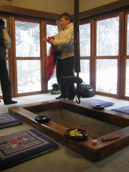 16:06 部屋には 部屋は離れ。 背面が廊下で、写真左手が隣の離れ、正面と右側が窓になっていて雪景色をながめることができ、部屋の中央には囲炉裏が配してあります。 いいですねぇ、囲炉裏。火だいすきです(笑) (でも、ちょっと寒い) と、囲炉裏に気を取られていましたが、背景の雪すごいですね。 完璧に積もってます。 |