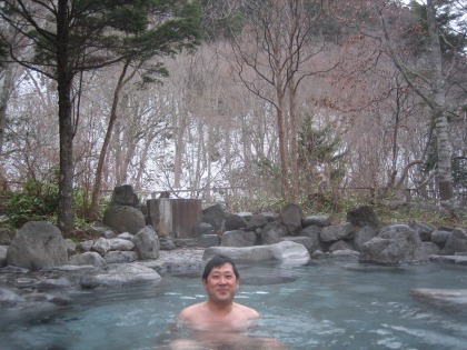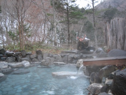 16:24 まずは広い方で 自分もまずは広い露天から。 『う〜ん。気持ちいい』 大きな露天は、周囲が寒いこともあり、少々冷えてぬるめ。いつまででも入っていられる温度です。 温泉は無色透明ですが、”湯の花”が沢山舞って、硫黄の臭いがプ〜ンとします。 |