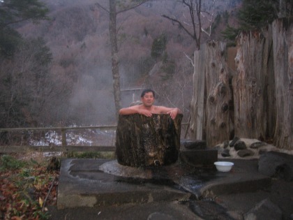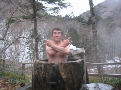 16:23 気持ちいいウィッシュ しっかり、入浴中のアイスエイジさん。 すっかりご機嫌で”気持ちいいウィッシュ”ってか。 この切り株もくり抜いて、温泉が引き込んであります。 広い露天もありますが、この狭さが、みょーに落ち着くんですね。 |