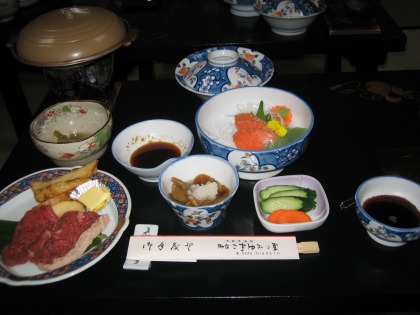18:25 夕ご飯です 露天風呂で暖まったあとは、部屋に戻って囲炉裏に座ってビール。 いやー、たまりません。(-o-) で、6時を過ぎて、待ってましたの、夕ご飯です。(^o^) 夕食は部屋食ではなく、食事処ですが、個室になっているので、落ち着いて食事ができます。 (まあ、どこで食べても落ち着いてるけどね) |