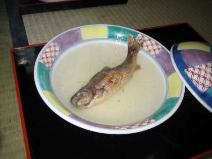18:32 骨酒 これは、”岩魚の骨酒”。 宿の案内を見ていたら、別注であったので頼んじゃいました。 「旨い!(~o~)!」 で、ついついお酒が進んでしまい。 追加で2合ほど。 |