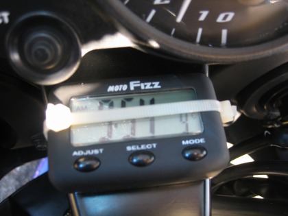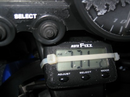 7:31 フリ〜〜〜ズ! 快晴と言うことは、夜の間放射冷却で気温が下がっているはず。 路面が凍結していないか、チェックするためにバイクのところに行くと・・・・・ バイクがガチガチにフリ〜〜〜ズ!しちゃってました。(笑) |