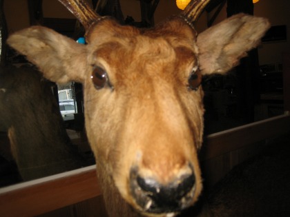 7:34 おっと、スーさん? なわきゃない。 宿の主、ロビーに置いてあった剥製です。 アップで見ると目が怖い。(目は作り物です) ところで、賢明な読者は既に気付いていると思うが、座敷童のスーさん、今回は仕事の都合で欠席です。 |