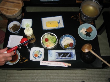 7:49 朝食です 朝食は大広間で。 平均的な旅館の和朝食。 昨晩の夕食と言い、この朝食と言い、海の物が出ない潔さは自分的に「◎」です。 |