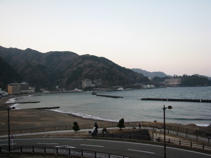 朝起きて、窓の外を見ると、土肥の海水浴場が目の前に広がっていました。