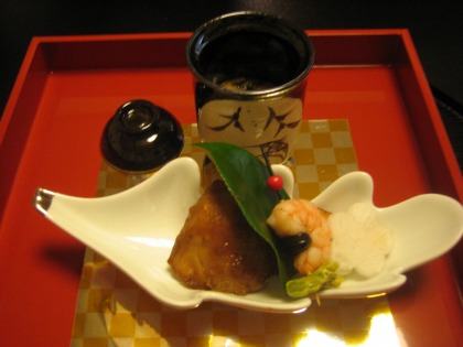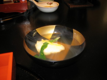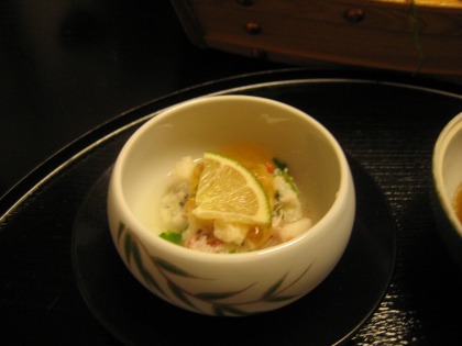 これは、カニの身と味付けした出汁を固めてジュレにしたもの。この旅館はどの料理も比較的薄味ですが、しっかりと出汁と取っているので、美味しいですね。