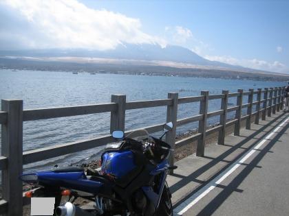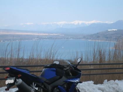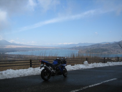 12:23 峠を越えて 三国峠を抜け、しばらく走ると目の前が開けて、眼下に山中湖が見えてきます。 自分はこの景色が見えてくるこのルートがお気に入りです。 今日は山中湖を挟んで遠くに雪を抱いた南アルプスの山々を見ることができました。 |