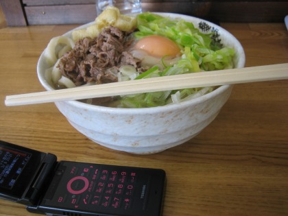 12:45 肉玉うどん(大) 注文してわずか2分、駅の立ち食い並の早さで、肉玉うどん(大)が出てきました。 決して作り置きをしているわけではなく、たまたま席に着いたタイミングが、うどんのゆで上がるタイミングと一致したから、早かった訳です。 相変わらず、盛りがいいですね。これで550円はお得。 大きさを比較しようと、携帯電話を手前に置いて写真を撮りましたが、大きく見えません。 パソコン雑誌に載っていたんですが、近くから写真を撮ると、近くのモノが強調されて大きく写り、遠くのモノが小さく写るんだそうです。知りません(気がつきません)でした。 なので、大きさを比較したい場合は、遠くからズームを使って取ると良いそうです。 雑談が長くなりましたが、早速いただきます。 相変わらず、吉田のうどんらしく、ゴワゴワです。 讃岐うどんの様にツルツルっと食べることはできません。 グワシグワシと噛んで食べます。 讃岐や稲庭うどんの人が食べたら、「これはうどんじゃない」と言いそうです(笑) でも、自分はこのうどんも好き。 美味しゅうございました。 |