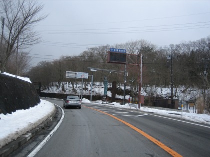 12:13 三国峠へ 県道365号線を一気に下り小山の町まで進み、その後県道147号山中湖小山線で富士スピードウェイに近い明神峠入口の交差点まできました。 さっき走ってきた足柄峠には残雪があったので、右折して山中湖方面に向かえば、標高の高い三国峠には、まだかなり雪が残っていそうです。 たしかに、県道の入り口には「滑り止め装着」と書いてありました。 とりあえず、行けるところまで行ってみることにします。 |