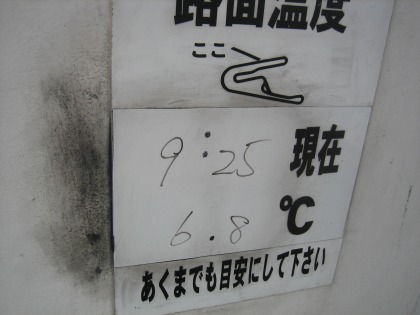 9:39 コンディション 路面走行前の気温6.6℃・・・・寒い! それよりも、風が少しあって、風速5mくらいの中風。 メインスタンド側から吹いているので、西風かな。 メインストレートでは左側から、バックストレッチでやや向かい風になる方向ですね。 風が強いので、日差しがあるものの、体感温度は気温以上に寒く感じます。 |
