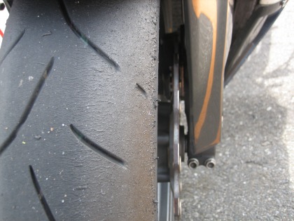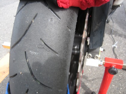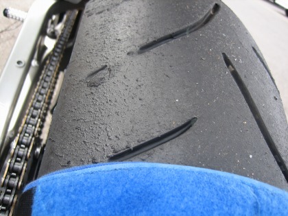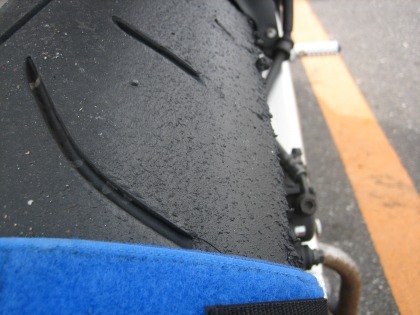 13:20 走行終了 2本目の走行が終了しました。 上の2枚 フロントタイヤ 下の2枚はリヤタイヤ 前後とも、左右とも、エッジ部分は残っています。 もう、一寝かし、もう少しスピードを上げることができますね。 ここまで使った距離は140kmです。 |
