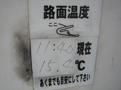11:57 途中のコンディション 路面温度は少し上がって、15.4℃ これくらいなら、そこそこタイヤも喰いますね。 気温はほとんど上がらず 8.9℃ 風は相変わらず吹いていて、さっきとほとんど変わらない状態です。 |