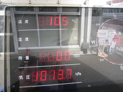 13:18 終了後の 終了後の気温。 ようやく10℃を越えて、10.5℃ 風が冷たい、練習走行でした。 |