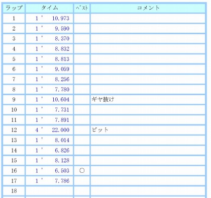 1走行目 10:00から。 今日はちょうど3ヶ月ぶりの練習になるので、まずは慣熟走行から。 なんて、書いているけど、やる気十分。 なんせ今年からCBRに乗り始めたハルナさんが、7秒台を出しているもんで、さすがにそれに負けるわけにはいきません。(と見得を切る) まあ、レベルの低い話。 まさに、ドングリの背比べ。 でも、このドングリの背比べのレベルが一番楽しい。(^O^) コースインして、2〜3周は様子をみます で、徐々にペースを上げてっ! 『ペースが上がりません!』 いやいや、参った。 久しぶりの走行と言うことで体が切れません。 P-LAPを見ると、8秒台! 『やばいっす!』 なんて、走っているうちに、腕が上がってパンパン。 力入りすぎですね。 9周目には、第2ヘアピンシフトミスのギヤ抜け。-_-; 8周目、10、11周目には7秒台に入るも、握力が無くなって12周目にはピットに入って休憩。 ちょっと、休んで体の力を抜いて、再度コースイン14周目には6秒台に入って、ひと安心。『って、安心している場合じゃありません』 |