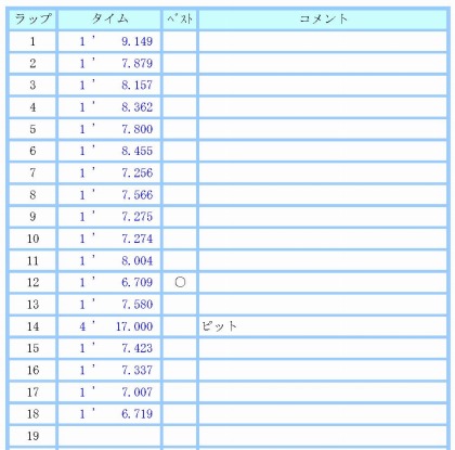 2走行目 12:00から 2本目もBクラスで、12:00から。 今回はちょっと作戦を変えて。 Bクラスの基準タイムは一応1分3秒〜7秒なので、基本的に自分より大体タイムが速いはず。 と言うことで、ちょっと速い人についていって引っ張ってもらおうと、「金魚のフン作戦」をすることに。 『結構楽について行けるじゃん』と思って、P-LAPを見てみたら1分7、8秒。 前を走っている連中は速くありませんでしたぁ。(ちゃんちゃん) と言うことで、途中から単独走行に切り替えて走りましたが、タイムあまり変わらないです。 今回も途中で、腕が上がって抑えが効かなくなったので、14周目にピットインして、ちょっと呼吸を整えます。 久しぶりのサーキットで、バイクを寝かすのに”ためらい”があるみたいなので、ヒザを余り出さずにバンクさせると、前後タイヤともズズッっと滑ります。 やっぱ荷重がかかってないのに、無理に寝かすと滑りますね。(当たり前か) ラップタイムをグラフにしてみました。 去年の12月よりタイムは良いみたいです。 1本目より2本目の方が平均的にタイムは良いみたいです。 周回を重ねた方がタイムは良くなってきている様です。 でも、高め安定。 しばらくぶりのサーキットで、体力が落ちちゃっているのを痛感しました。 まじめに筋トレしないとまずいですね。 |