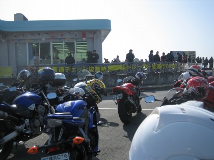 9:02 西湘SAに到着 西湘バイパスのパーキングに到着しました。 2週間前と大違い。 正に”啓蟄(けいちつ)”のごとく、バイクがわき出してきたようです。 おかげで、いつも駐めているバイクの駐輪場が一杯で駐めきれず、四輪車枠にバイクを駐めます。 |