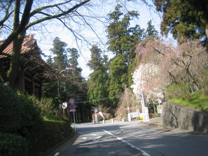 9:45 いつもの林道 西湘のパーキングで集合した後、いつもの様に小田原インターで下りて、南足柄広域農道を進み足柄方面を目指します。 途中にある大雄山最乗寺の仁王門付近では、早咲きの桜(たぶん)が開花していました。 |